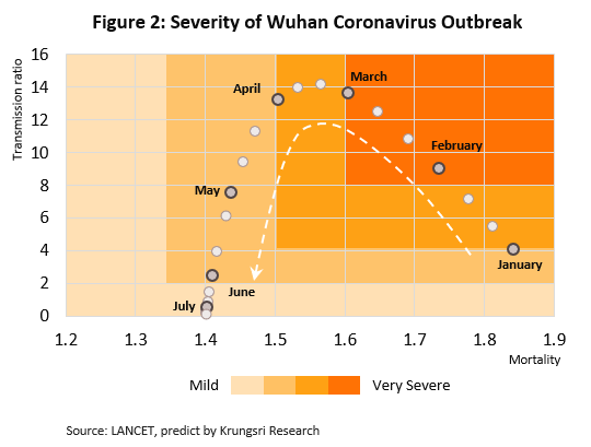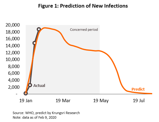 In order to predict how long it would take to effectively contain the outbreak, Krungsri Research adopted the Susceptible-Infected-Recovered model (SIR model) with epidemiological characteristics of the virus. The conclusion is the outbreak could peak in March and be contained by May. The model predicts new infections could rise to nearly 20,000 cases a week at the peak in March, before dropping to 12,000 in April and May [See Figure 1].