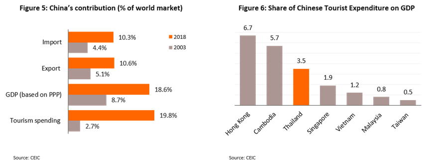 China’s rising contribution to the global economy. China is the world’s second largest economy. Its contribution to the global economy rose from 8.7% in 2003 to 18.6% in 2018. The Chinese accounted for 19.8% of the global tourist market in 2018, compared to only 2.7% in 2003. And during the same period, China’s share of international trade had risen two-fold.
