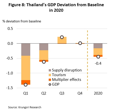 Thai economy would be affected by weaker tourism receipts, supply disruption in China, and income effects. Like its neighbors, Thailand’s economic growth is forecasted to drop by 0.4 ppt in 2020 [Figure 8]. The tourism sector would be responsible for 0.23 ppt drop and trade disruption for 0.16 ppt. The model also suggests the impact on the tourism sector would peak in the first quarter of 2020, and the impact from supply disruption would peak in the second quarter.