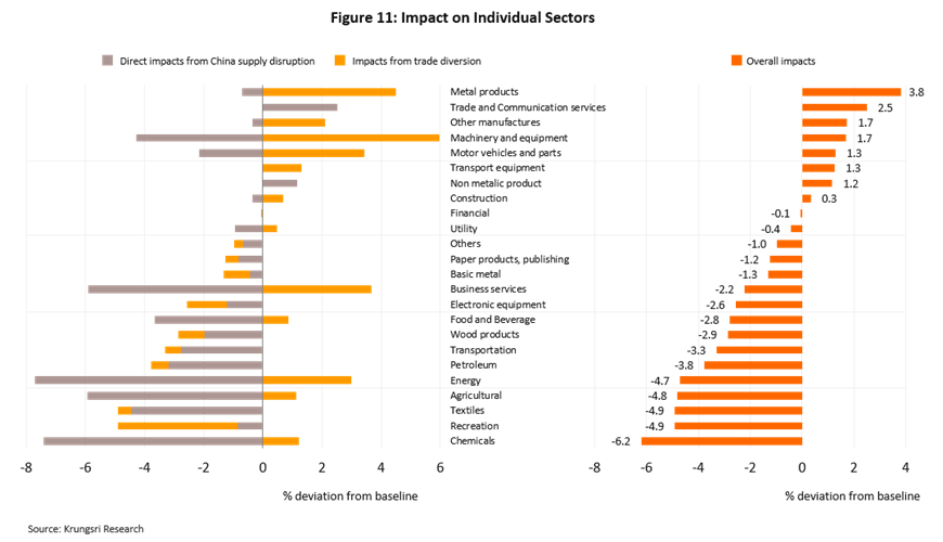 Mixed impact by sector. Our model suggests almost all sectors would be hurt by a slower China economy. But some sectors would gain from trade diversion and could expand. These include Metal Products, Trade and Machinery sectors. At the same time, Chemicals, Recreation and Textile sectors could be hit hard because of large exposure to China [See Figure 11].