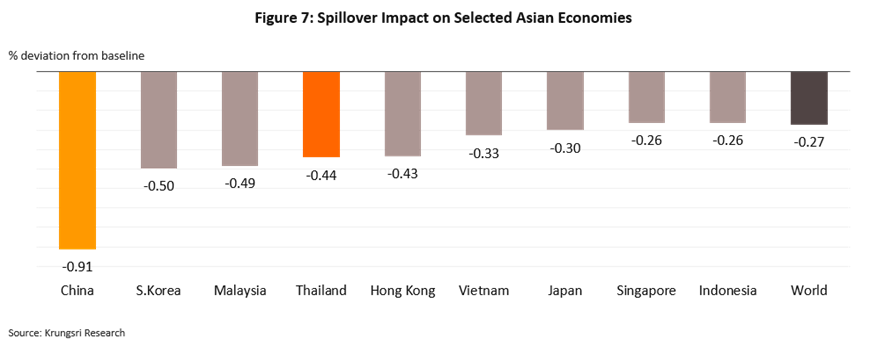 Krungsri Research attempted to measure the spillover effects by applying the computable general equilibrium model (CGE). We also adopted the vector auto-regression model to assess how economies react periodically to these changes. The conclusion is that economic growth in selected Asian countries would be reduced by 0.26-0.50 ppt from baseline projections. South Korea and Malaysia will lead the chart. Global economic growth would be reduced by 0.27 ppt [See Figure 7].