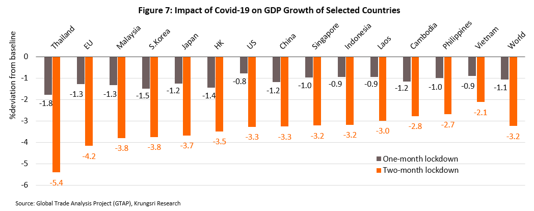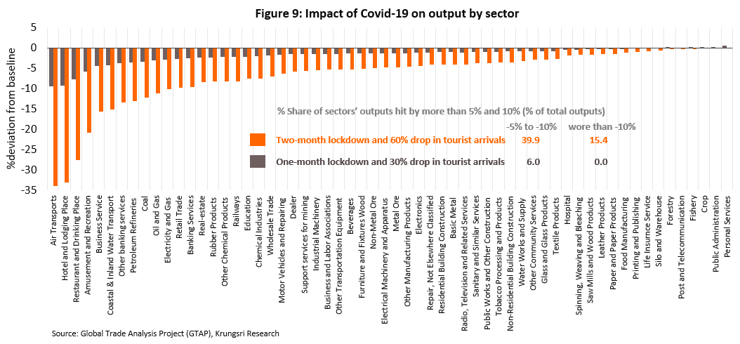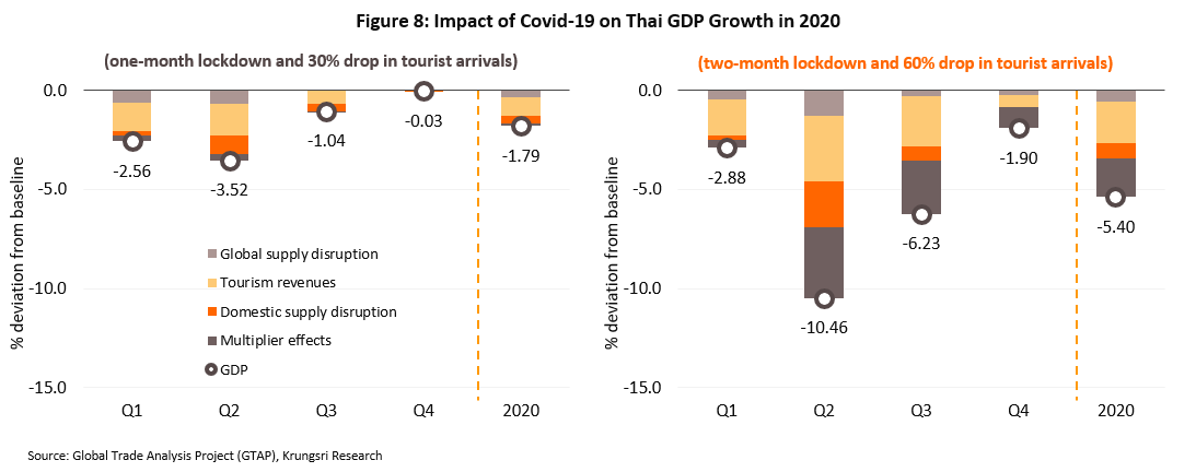 Given the rapidly changing situation, we are tweaking our model for the third time to include more accurate assumptions on the impact of global disruption, domestic shutdown, and negative income multiplier effect. Our model suggests the Thai economy would be one of the hardest hit by the pandemic. If we assume a two-month lockdown with a 60% drop in tourist arrivals, the outbreak would reduce global GDP growth by 3.2ppt from baseline forecast (pre-outbreak). ASEAN GDP growth could be reduced as much as 2.1-5.4 ppt from baseline projections (pre-outbreak). Krungsri Research now projects the outbreak would hit the Thai economy hardest among key countries, followed by the EU, Malaysia, and South Korea. We estimate the impact on Thai GDP through the following channels – tourism, supply disruption at home and abroad, and multiplier effect. We now project the Covid-19 pandemic would reduce Thai GDP growth by 5.4 ppt from baseline forecast, compare to previous estimate of -1.8%.