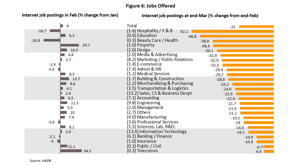 There is evidence that employment has been affected substantially. We looked at online job postings and found a sharp drop over the past month. The total number of job posting on the JobDB website as at 31 March had dropped by 22.1% since end-February. This contrasts with the 4% growth in February postings. In March, the sectors hardest hit by the pandemic were Hospitality (-52%), Education (-47%), Beauty & Healthcare (-39%), and Property (-38%). The travel-related sector saw a decline in job postings for the second straight month.