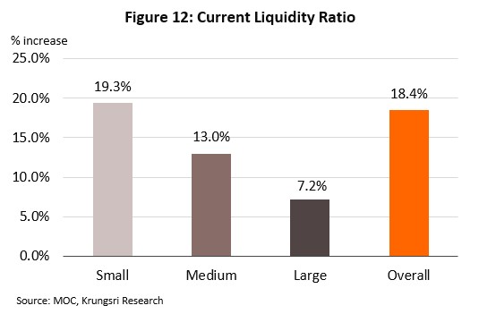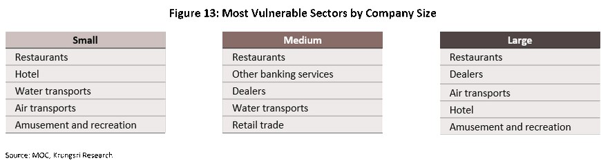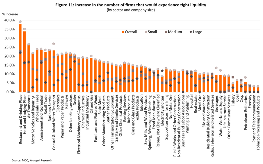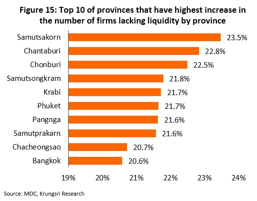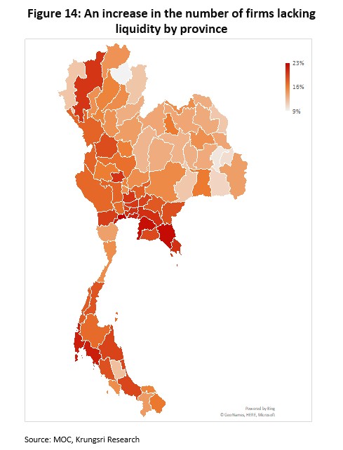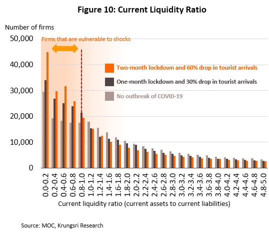 By location, the number of firms that would face tight liquidity due to the pandemic would surge in Samutsakorn, Chantaburi, and Chonburi provinces. These are provinces that are major tourist destinations or industrial areas. Meanwhile, the number of firms in trouble in Bangkok would increase by 20.6%. The higher possibility of default in these provinces might generate a second-round of negative effects on the local economy, through falling employment and lower income. This would, in turn, hurt the overall economy.