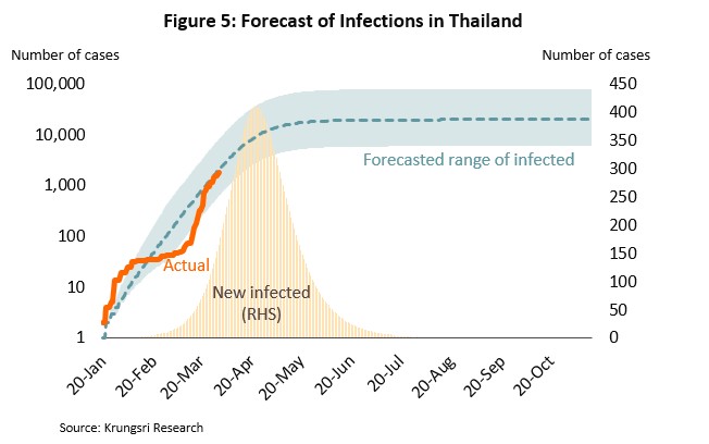 We estimate the number of infections in Thailand will peak in April, but the outbreak would last until May. Hence, we assumed tourist arrivals would remain weak, domestic economic activity would be limited, and there would be stricter containment measures for at least the next 2 months. The SIR model suggests the number of infections in Thailand would reach almost 20,000 within that period. But if the containment measures are insufficient, the number could reach 80,000. The model suggests the domestic outbreak would peak in the second half of April and would be contained by end May.