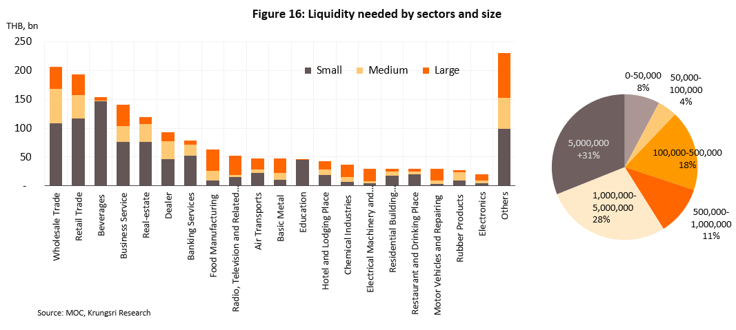 All in, the Covid-19 impact could cause firms in Thailand to seek Bt1.7 trillion worth of short-term liquidity, which is about 10% of GDP (Figure 16). This estimate is based on the total shortfall in the amount required by these firms to pay their liabilities within the next one year. Without restructuring debts and businesses, firms in the wholesale and retail trade would need almost Bt200 billion each to pay their short-term liabilities. Meanwhile, the hotel, air transportation, and restaurant sectors -- the hardest-hit – would require Bt30-50 billion to survive. In total, almost 60% of firms in trouble would need more than Bt1.0 million each.