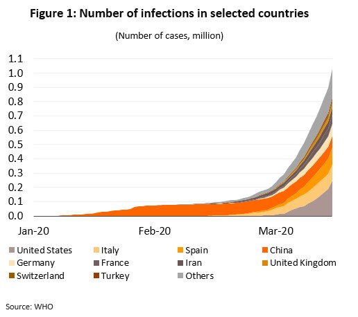 In response to the escalating coronavirus outbreak worldwide, the World Health Organization declared Covid-19 a global pandemic on March 11. The outbreak which reportedly started in China at the end of 2019 had spread to 115 countries when WHO declared Covid-19 a global pandemic. As at April 3, the number of infections worldwide has exceeded one million in over 200 countries, and cases and the death toll continue to rise (Figure 1).