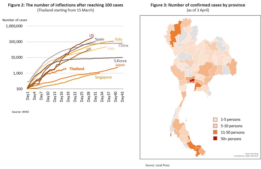 Number of cases in Thailand are accelerating, and the virus has spread to 60 provinces throughout the country. Recent data show the number of cases is rising steadily with no sign of flattening. Total number of cases was close to 2,000 as at April 3. Cases have risen more rapidly in major provinces (Figure 3).