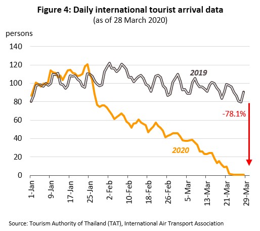 The outbreak itself and strict protection measures immediately hit tourism sector and create supply disruption. Covid-19 pandemic has substantially reduced tourist arrivals. Between 1 and 28 March, the total number of inbound travelers at the five airports tumbled 78.1% YoY, led by Chiang Mai Airport (-91.9%), followed by Don Mueang (-82.7%), Suvarnabhumi (-78.2%), Hat Yai (-75.9%), and Phuket (-69.6%). Many countries have imposed travel restrictions in attempts to contain the outbreak, according to the International Air Transport Association. Stricter measures by many countries would help to contain the spread, but at the same time they would prevent domestic and international travel and deal a severe blow to the tourism industry. It also disturbs global and domestic supply chains, which in turn hit domestic economic activities.
