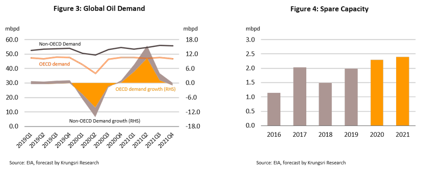 A rebound in oil demand would encourage oil producers to resume production 2021, and that would trigger a new round of real price war. We expect oil demand to return to normal by late-2020 or early-2021, which would encourage higher oil production. But, the huge global oil inventory will continue to weigh on crude prices. We estimate oil supply would increase by 6.2 mbpd to 102.7 mbpd in 2021, with 3.8 mbpd coming from OPEC members.