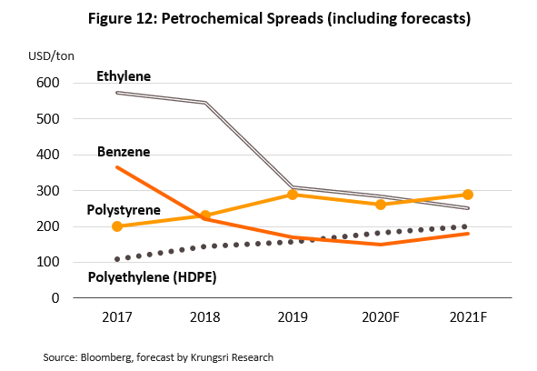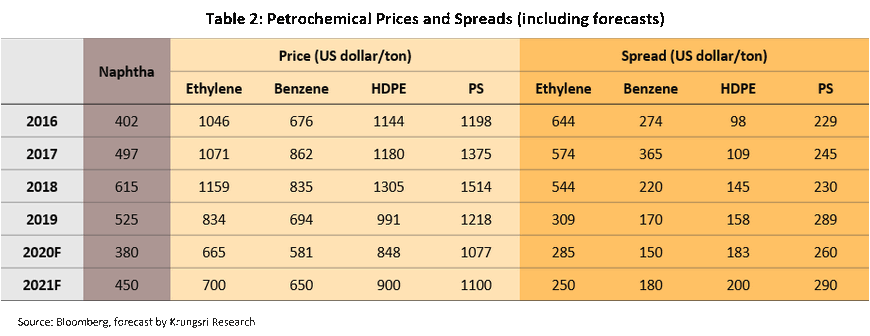 Petrochemicals will also have a tough year. The sharp drop in petrochemical demand following the crippled economic activities will hurt petrochemical spreads, from ethylene to ABS. Although feedstock costs have tumbled, prices of petrochemicals products are expected to drop by a larger magnitude. This means petrochemical spreads – a key profitability measure for petrochemicals – would also decline. Krungsri Research forecasts naphtha prices would drop by 27% in 2020 to $380 a ton. Ethylene price would fall to $664.9 a ton, which would reduce ethylene spread to an average of $284.9 a ton in 2020 from $308.7 in 2019. However, spreads for most petrochemical products would recover in 2021 as demand for petrochemicals from the industrial sector recovers.