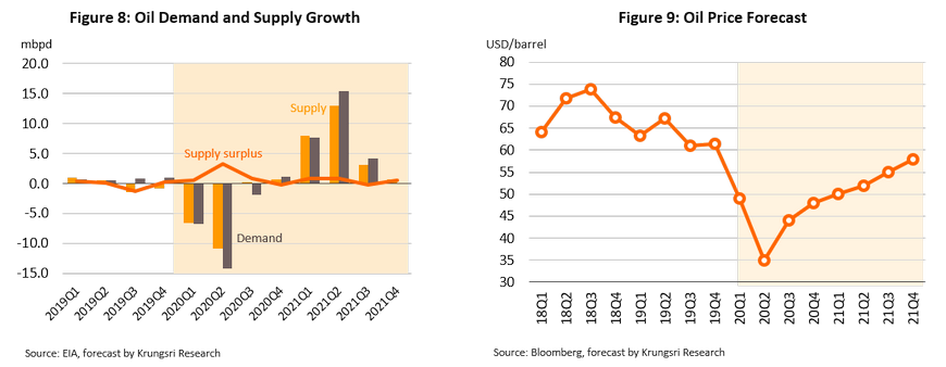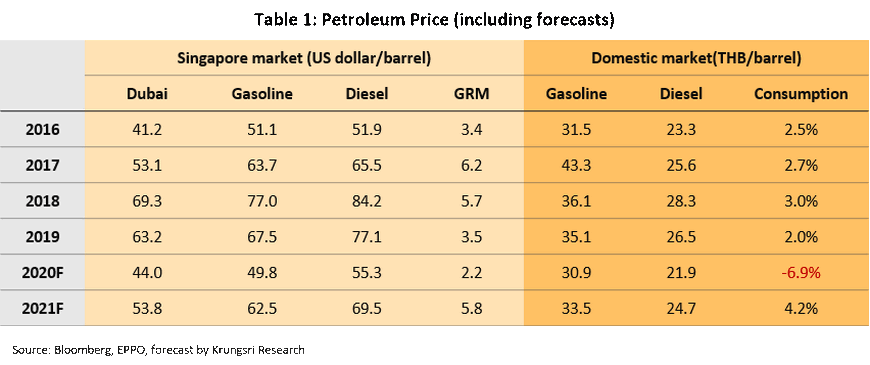 Krungsri Research expects Dubai crude oil price to stay low through to the third quarter of 2020 and recover in the last quarter. Oil price is projected to average $44 a barrel in 2020. The era of low oil prices would hit oil-related industries including E&P, oil refineries, and petrochemicals, due to weak demand.