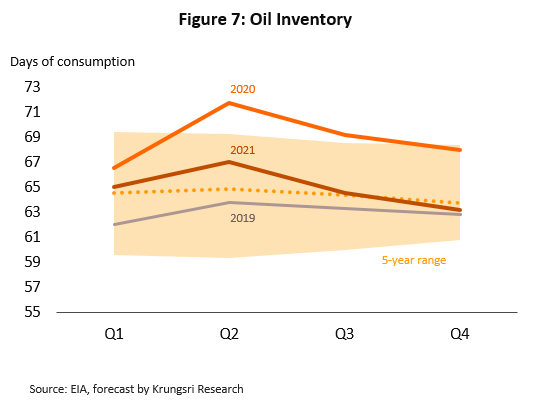 Global oil demand is projected to drop to 95.3 mbpd while oil production is estimated at 96.5 mbpd. This translates into 1.1 mbpd surplus in the global market in 2020, taking global oil inventory to a new high. The surplus could reach 3.4 mbpd in the second quarter. As a result, US inventory - a key benchmark for the global oil market- would rise to nearly 1,400 mbpd, or 71.7 days of oil consumption in the US (the highest level since 2015). However, we expect more balanced demand and supply conditions in the global oil market in 2021 as demand growth returns to normal.