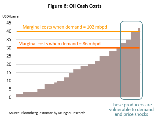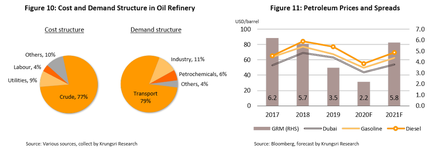 Refinery players would be hit hard by tumbling demand and record-low GRM. In the next two quarters, the refinery industry would be hit by both weak oil prices and slowing demand. Travel bans and lockdowns have drastically reduced transportation and industrial activities, the two biggest oil consumers which collective absorbed about 80% of total world oil consumption prior to the pandemic. When demand falls, price of refined products will drop at a faster pace than crude prices. Krungsri Research projects gasoline and diesel prices in Singapore market would average only $37 and $40, respectively, in the second quarter of 2020. This could reduce gross refinery margins (GRM) to $0.9 a barrel.