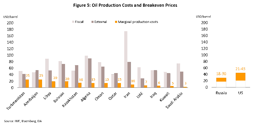 Saudi Aramco has lowest oil production cost, but Saudi Arabia might not like it. In Saudi Arabia, it can cost as little as $3 to produce a barrel of oil, much lower than in the US and Russia where the lowest cost is about $21 and $18, respectively. This means oil prices could dive below $20 a barrel. However, the fiscal and external breakeven oil prices for OPEC members suggest several countries require oil prices to stay above $40-50 a barrel to balance their fiscal and external accounts. If oil prices remain below the fiscal breakeven price for an extended period, those countries would have to cut public spending, which could in turn, threaten political stability in the region.
