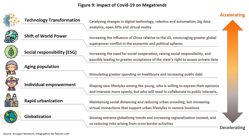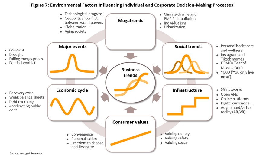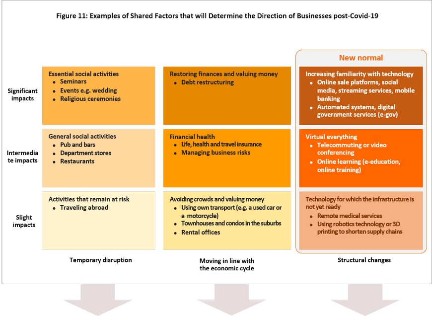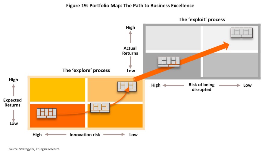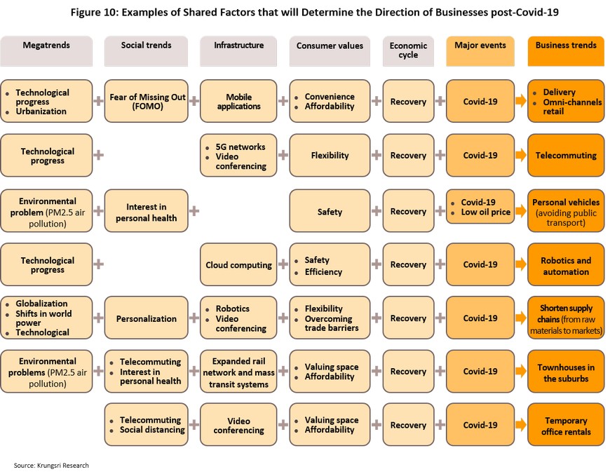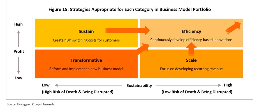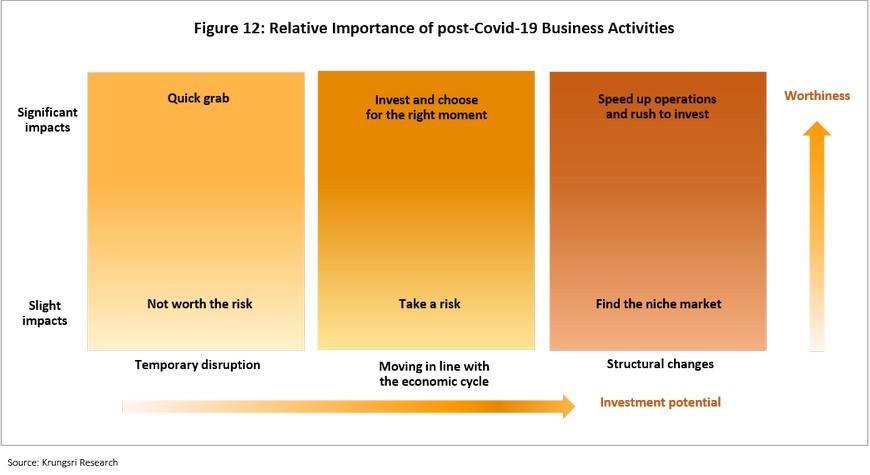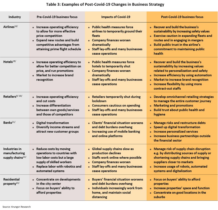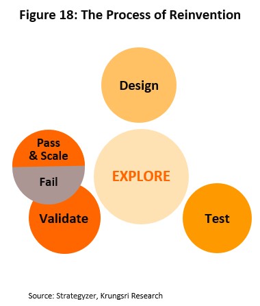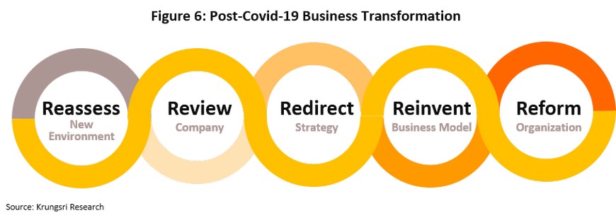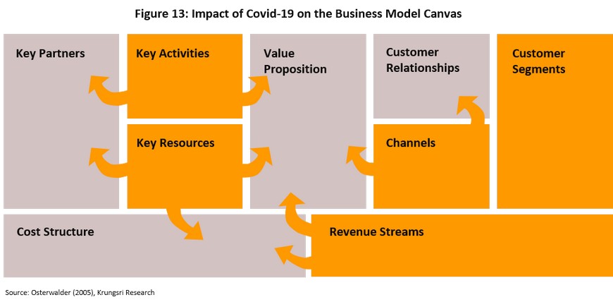 Krungsri Research believes that in the coming period, the key to survival for many businesses will be our adaptability and our ability to develop stronger, more vibrant business models, especially with regard to the value propositions in offering a solution to consumer problem. Simultaneously, organizations will need to look for ways to encourage business innovation and to develop new markets. In some cases, companies will need to leave the environments where they used to compete in new arenas. Indeed, the track record of many companies and the recent experience of Covid-19 show that although new business models may not provide huge returns today, they may nevertheless have the potential to transform industries in the future.