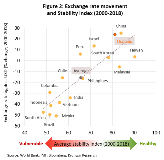 The strength of the baht can be attributed in part to the basic issue of Thailand’s external stability, that is, the country’s ability to maintain resiliency in response to external risks. Since the Asian financial crisis of 1997-1998, Thailand has consistently run a current account surplus, while maintaining large foreign exchange reserves, reflecting the fact that foreign currency inflows tend to outrun outflows. In addition, domestic inflation remains low and the ratio of external debt to foreign exchange reserves is lower than that in many other emerging markets. To investigate this further, Krungsri Research has analyzed the relationship between the strength of the Thai baht and the country’s stability index. The index is in line with the International Monetary Fund’s methodology which is composed of four key economic indicators: the ratio of the current account balance to GDP; the ratio of foreign exchange reserves to GDP; the inflation rate; and the ratio of external debt to foreign exchange reserves. Data for the past two decades show that the stability index and the strength of the baht are indeed positively correlated and so countries that are more stable tend to have relatively stronger currencies (Figure 2).