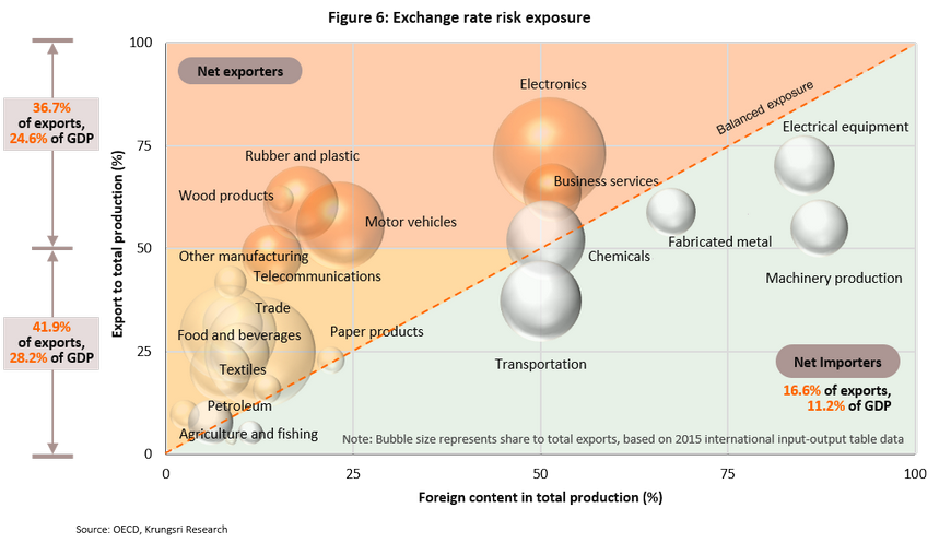 - Industries that experience severe impacts of baht appreciation are typically producing primarily for serving external demand and these account for 36.7% of Thai exports, or 24.6% of GDP. These industries consist of electronics industry, motor vehicles, wood products, rubber and plastics products, and providers of business services.