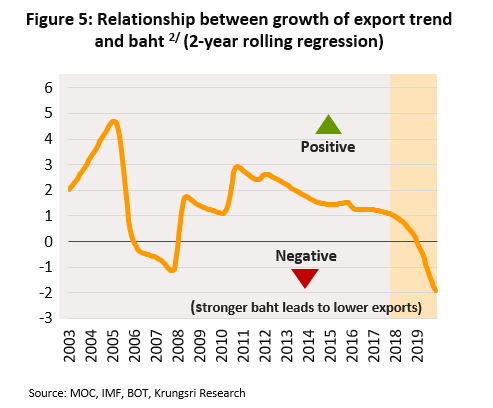 To further investigate the relationship between the value of the baht and trends in export growth, the data were analyzed using a rolling regression (Figure 5) and this shows that over the past 2 years, the appreciation of the baht has led to a drop in exports. In situations when the baht strengthens over the short-term, the fall in the volume of exports may prompt exporters to try to maintain revenue and competitiveness by sacrificing a degree of profitability and cutting export prices. However, if the appreciation in the currency happens over an extended period or is driven by structural factors, the pressure to continually cut prices will in the end erode exporters ability to generate any returns on investments, leading to a reduction of total output of the economy, although the exact impacts for individual businesses will vary from one industry to the next.