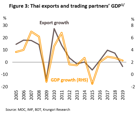 - In the short-term, a 10% appreciation of the baht will lead to a decline in GDP of 0.4%, a drop in domestic investment of 0.8%, and a contraction in imports and exports of respectively 5.5% and 6.3%, respectively. In this case, the fall in imports will be caused by a drop in demand for raw materials and intermediate goods that would otherwise have been processed into exports.