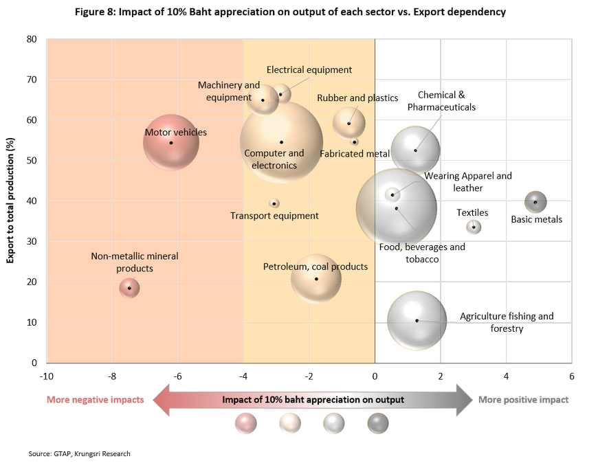 - Industries that are positively affected by baht appreciation are net importers, but these account for only a small proportion of Thai economy, covering 16.6% of Thai exports, or 11.2% of GDP. Industries in this group typically import raw materials or intermediate goods in large quantities and so benefit from the falling cost of imports. These industries includes electrical equipment production, transportation, machinery production and fabricated metal production.