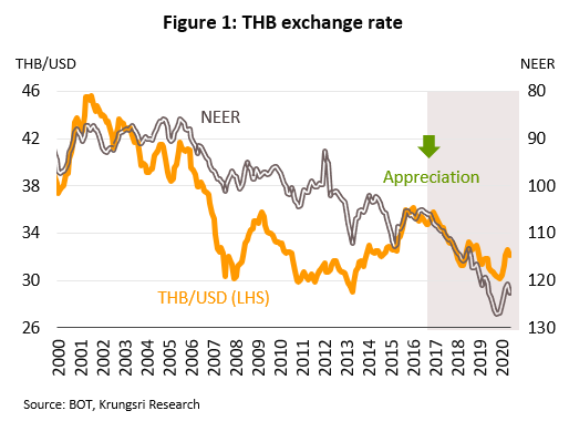 Following Thailand’s rapid eradication of community transmission of Covid-19 and the subsequent reopening of businesses across the country, the Thai baht has steadily strengthened and this appreciation in value has outpaced that of the currencies of the country’s major trade partners, leading to fears over the effects of this on the wider economy. However, the strengthening of the baht is not a recent phenomenon and over the past two decades, the baht has risen in value by more than 30% relative to these same currencies, generating concerns over the export sector, a key driver of growth for the Thai economy. An analysis of the structure of Thailand’s production sector and the connections between exports and national economic activity based on input-output tables shows that Thai industries/businesses who are net exporters (export value exceeds import value ) account for over half of Thailand’s total outputs and these industries will be negatively affected by the appreciating of the baht. A sensitivity analysis based on a general equilibrium model reveals that a 10% appreciation in the value of the baht will reduce 0.4 percentage points (ppt) from Thai GDP growth over the short-term, decreasing as much as 0.8 ppt over the long-term, in addition to slashing foreign direct investment by 17 ppt. Automobile industry is among the industries most severely affected by this. Computer and electronics industries see moderate negative impacts. Overall, the effect of a stronger baht is to undermine the competitiveness of the export sector, potentially pushing foreign investors to move production facilities out of the country and eroding the long-term growth potential of the Thai economy.