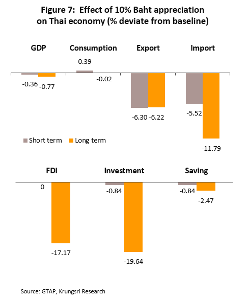 Krungsri Research has carried out additional research into the short- and long-term impacts on economic variables of the appreciation of the baht. This applies a sensitivity analysis under a general equilibrium model, with the assumption that in the short-term, FDI will be unaffected by changes in exchange rates but over the long-term FDI will respond to currency movements. The results of this analysis are given below.