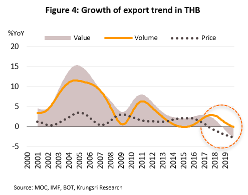 Generally, falls in the volume of exports are caused by a weakening of demand in export markets rather than by the costs of the goods or exchange rates, and data on Thai exports indicate that economic growth in export markets has indeed been relatively closely coupled with growth in Thai exports (Figure 3). Thus, in the past, as trade partners’ growth rates slowed, demand in these markets softened and this then undercut Thai exports. Figure 4 shows that the growth in exports slowed significantly in terms of both volume and value. Furthermore, over the past 1-2 years, the export price index in terms of baht has fallen at a faster pace, reflecting the reduction in manufacturers’ profit margins in order to cushion the impact of Thai baht appreciation.