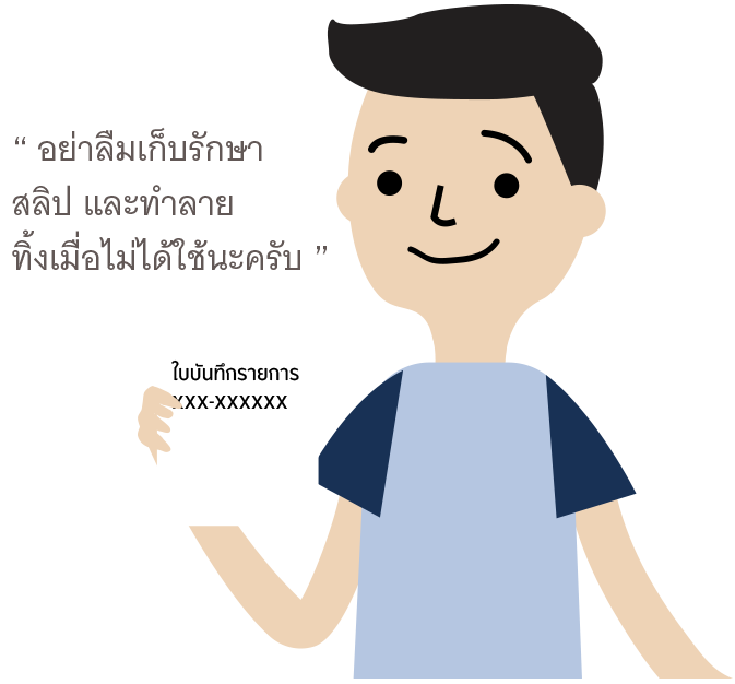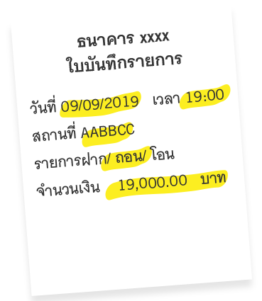 ข้อมูลที่สำคัญ (วัน /เวลา สถานที่ ประเภทของการทำรายการ จำนวนเงิน) หรือ ใบบันทึกรายการ (ถ้ามี)