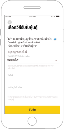 เลือกวิธีการรับใบหุ้นกู้ “ฝากศูนย์รับฝาก” พร้อมกรอกรายละเอียด หรือ “ส่งไปรษณีย์” ตามที่อยู่ที่ผู้จองซื้อระบุ