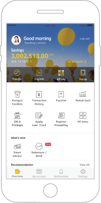 - มีบัญชีออมทรัพย์ (ไม่ใช่บัญชีร่วม) และบัญชีดังกล่าวต้องผูกกับ KMA – Krungsri Mobile App