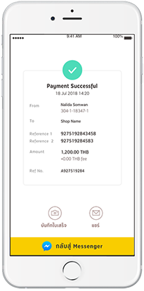 หน้าจอแสดงสลิปการโอนเงินสำเร็จ กดกลับสู่ Facebook Messenger