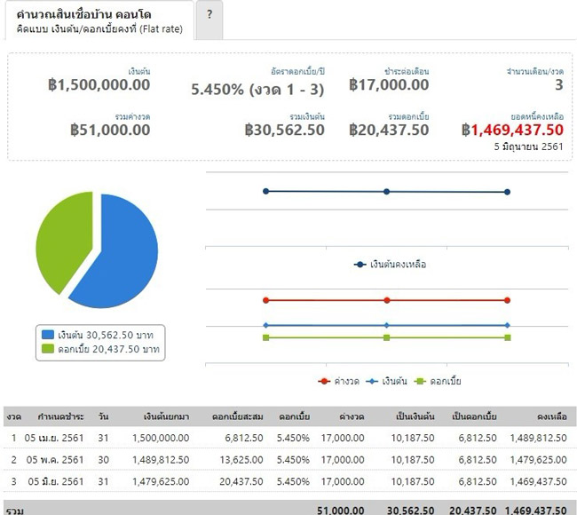 ภาพตัวอย่างจากเว็บ Thaiinterest เครื่องมือคำนวณสินเชื่อบ้าน คำนวณได้ทั้งแบบเงินต้น/ดอกเบี้ยคงที่ (Flat Rate) กับแบบลดต้นลดดอก (Effective Rate)