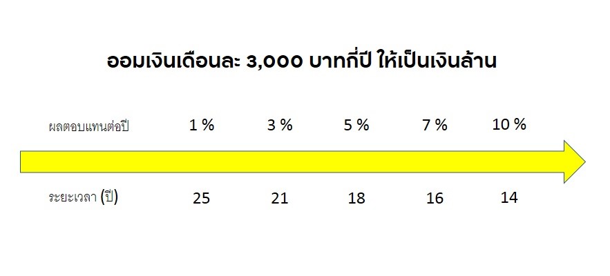 จากรูป หากออมเดือนละ 3,000 รับความเสี่ยงได้น้อยมาก สามารถคาดหวังโอกาสสร้างผลตอบแทนได้ประมาณ 1% ในเงินฝากอย่างเช่น เงินฝากออมทรัพย์ (ฝากเกิน 1 แสนบาทขึ้นไป) กว่าจะมีเงินถึง 1 ล้าน อาจต้องใช้เวลาถึง 25 ปี แต่หากรับความเสี่ยงได้สูงขึ้นโดยลงทุนในผลิตภัณฑ์อย่างเช่น กองทุนรวมหุ้น ที่สามารถคาดหวังโอกาสสร้างผลตอบแทนได้ประมาณ 7% จะใช้เวลาเพียง 16 ปีเพื่อพิชิตเงินล้านแรก อย่างไรก็ตามรูปนี้ เป็นเพียงภาพจำลองเท่านั้น แนะนำว่า ควรติดต่อที่สาขาธนาคารกรุงศรีอยุธยาใกล้บ้านท่าน เพื่อทำแบบประเมินความเสี่ยงก่อนเริ่มลงทุน สาขามีเจ้าหน้าที่ให้บริการพร้อมแนะนำผลิตภัณฑ์การลงทุนที่เหมาะสมกับตัวท่านเองครับ