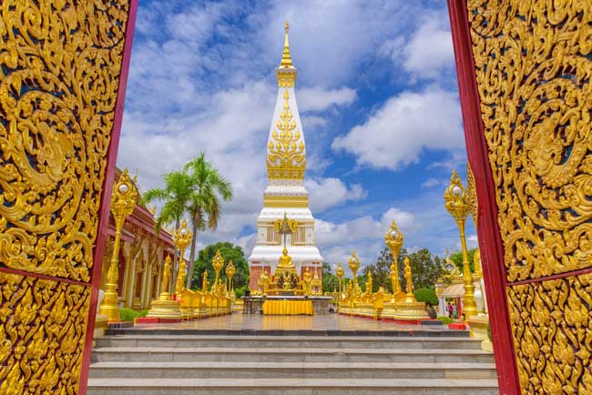 พระธาตุพนม อ.ธาตุพนม จ.นครพนม เป็นปูชนียสถานอันศักดิ์สิทธิ์ของภาคอีสาน ตามตำนานเชื่อว่า สร้างขึ้นในสมัยอาณาจักรศรีโคตรบูรณ์ โดยเจ้าเมืองห้าพระองค์ เพื่อประดิษฐานพระอุรังคธาตุ (กระดูกหน้าอก) ของพระพุทธเจ้า