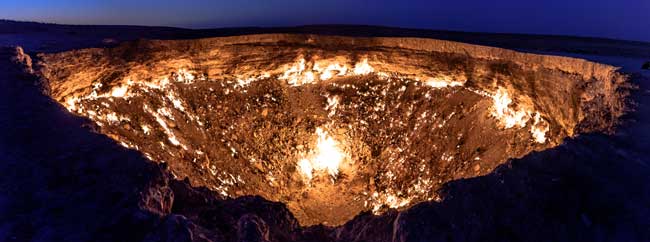 เป็นอีกหนึ่งสถานที่น่าตื่นตาตื่นใจและน่าสะพรึงกลัวในคราวเดียวกัน ประตูสู่นรก หรือ The Door to Hell เป็นหลุมไฟขนาดใหญ่กลางทะเลทรายคาราคุม ใกล้เมือง Derweze ประเทศเติร์กเมนิสถาน ลุกโชนมานานหลายทศวรรษ ถูกค้นพบในปี 1971
