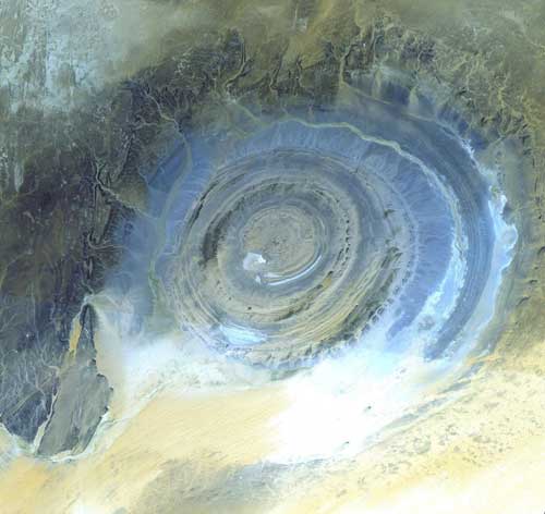 ณ ดินแดนอันแห้งแล้งบนทะเลทรายซาฮาร่า มีสถานที่อันแปลกประหลาดที่ถูกค้นพบโดยดาวเทียมของนาซ่า ตั้งอยู่ในประเทศมอริเตเนีย ทวีปแอฟริกา มีลักษณะเป็นหลุมรูปวงกลม มีวงแหวนซ้อนระยะห่างเท่า ๆ กัน มีเส้นผ่านศูนย์กลางถึง 40 - 50 กิโลเมตร เมื่อมองจากยานอวกาศปรากฏเป็นรูปร่างคล้ายดวงตาสีฟ้า เป็นสิ่งที่น่าพิศวง จนนักธรณีวิทยาต่างตั้งข้อสันนิษฐานต่าง ๆ นานากับการเกิดขึ้นของสิ่งนี้ บางคนเชื่อว่าเกิดจากหลุมอุกกาบาต แต่เมื่อพิสูจน์กลับไม่ใช่ บ้างก็เชื่อว่าเกิดจากการกัดเซาะของลมและน้ำ แต่ไม่มีข้อสรุปที่ชัดเจนว่าทำไมถึงเป็นรูปทรงกลม