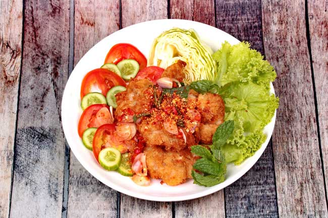 ข้าวยำไก่กรอบ เมนูอาหารจานเดียวสุดจี๊ดจ๊าดที่รู้จักกันดี หากได้เห็นเมื่อไหร่ เป็นต้องขอลิ้มลอง แต่รู้หรือไม่ว่าใต้คำโฆษณาอร่อยจี๊ดจ๊าด เมนูนี้กลับให้พลังงานสูงถึง 640 แคลอรีต่อเสิร์ฟเลยทีเดียว ด้วยวิธีทำที่เริ่มจากนำสะโพกไก่หั่นชิ้นมาชุบเกล็ดขนมปัง แล้วทอดจนหอมกรุ่น กรอบนอกนุ่มใน จากนั้นคลุกเคล้าด้วยผงปรุงรสสุดเข้มข้น แล้วนำมาคลุกกับน้ำยำอีกครั้ง ก่อนจะโรยด้วยสะระแหน่ ตักราดกับข้าวสวยร้อน ๆ ขอบอกว่าใครก็ต้านทานได้ยาก