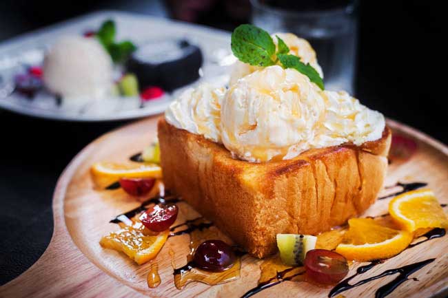 โดยแต่ละปริมาณการเสิร์ฟประกอบด้วยขนมปังอบนุ่มชุ่มเนย ควบคู่มากับสารพัดท็อปปิ้ง และเพิ่มระดับน้ำตาลให้สูงปรี๊ดกว่าเดิมด้วยไอศกรีมลูกใหญ่จำนวนสองลูก พูดซะขนาดนี้คงไม่ต้องบอกมากกว่าพลังงานจะสูงแค่ไหน 500-700 เชียวล่ะ เพราะทั้งหวานและมัน ฉะนั้นควรแบ่งกันทานคนละคำสองคำจะดีต่อสุขภาพมากกว่านะ