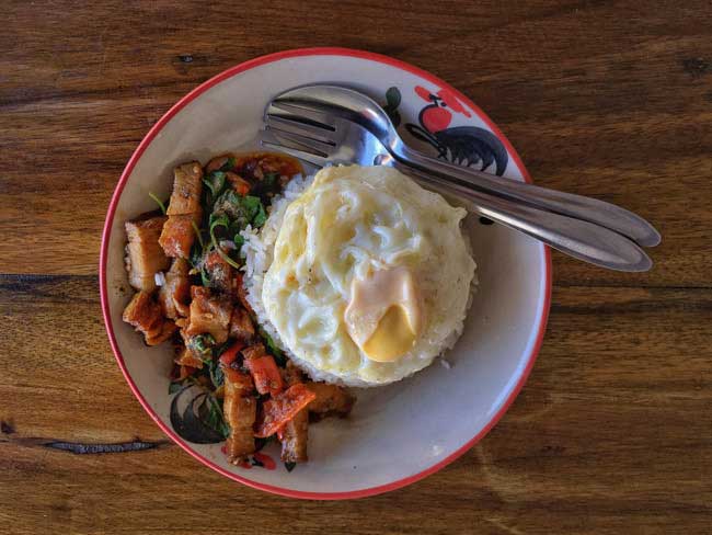 หากพูดถึงผัดกะเพรา หลายคนชอบพูดว่าเป็นเมนูสิ้นคิด แต่ลองเติมคำว่าหมูกรอบเข้าไปอีกสักหน่อยรับรองว่าตาลุกวาวแน่นอน เพราะเมนูนี้เป็นการยกระดับ ‘หมูสามชั้น’ หรือ ‘มันหมู’ ที่ผ่านกรรมวิธีมากมาย มาทอดให้เหลืองกรอบนอกนุ่มใน แล้วมาผัดปรุงรสกับใบกะเพรา สมุนไพรบ้าน ๆ จนได้รสชาติกลมกล่อม ใครได้ลิ้มลองก็มีแต่ติดใจ