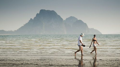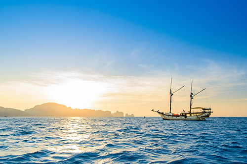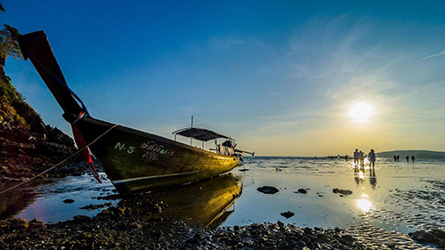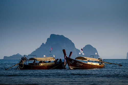 ภาพนี้ถ่ายที่ระยะ 200mm ใช้สีคู่ตรงข้าม คือ สีฟ้าของท้องฟ้าและน้ำทะเล ตัดกับสีเหลืองทองของแสงแดดยามเย็น
