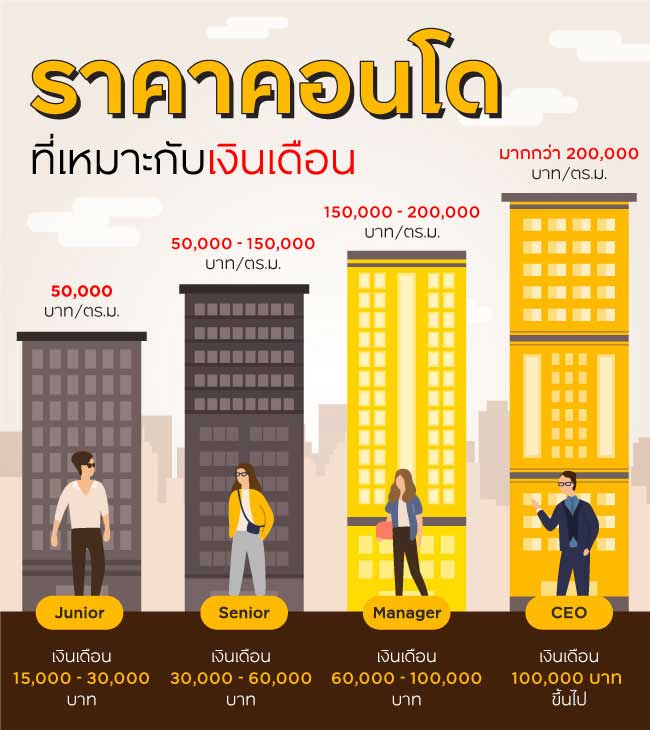 เลื่อนขึ้นมาอีกระดับ ก็จะเป็นผู้จัดการหรือระดับหัวหน้าแผนก ตำแหน่งนี้ฐานเงินเดือนจะอยู่ที่ 60,000 – 100,000 บาท สามารถเลือกซื้อคอนโด High Rise ในแบบ Luxury ได้เลย เรทราคาที่แนะนำประมาณ 150,000 – 200,000 บาทต่อตารางเมตร ขนาดพื้นที่ใช้สอยราว ๆ 25-35 ตารางเมตร ขึ้นอยู่กับไลฟ์สไตล์ เช่น ซื้อไว้อยู่อาศัยคนเดียวควรเลือกที่ขนาดกะทัดรัด แต่ถ้าอยู่ 2 คนก็ควรเพิ่มพื้นที่ให้กว้างขึ้น ซึ่งคอนโดเรทราคาเท่านี้มักจะมีทำเลที่อยู่ติดกับสถานีรถไฟฟ้าในเขตใจกลางเมือง อย่าง อโศก สีลม ทองหล่อ หรืออยู่ในย่านเศรษฐกิจ ทำเลทองสำคัญต่าง ๆ เช่น ริมแม่น้ำเจ้าพระยา และสิ่งอำนวยความสะดวกต่าง ๆ ครบครัน ให้ความสำคัญกับพื้นที่ส่วนกลาง มีการดูแลความปลอดภัยที่รัดกุม ให้ความเป็นส่วนตัว มีพื้นที่เลาจน์ให้คุณได้ใช้งานโดยมีการตกแต่งที่สวยงาม และหากต้องผ่อนคอนโดก็ไม่จำเป็นต้องผ่อนในระยะยาว สามารถผ่อนในระยะสั้นได้ เช่น ประมาณ 10 ปี เพื่อลดภาระการใช้จ่ายในระยะยาวเพราะมีกำลังทรัพย์มากเพียงพอ และยังเปิดโอกาสให้เรานำคอนโดนี้ไปลงทุนต่อได้ อย่างเช่น ปล่อยเช่าหรือขายต่อเพื่อทำกำไร