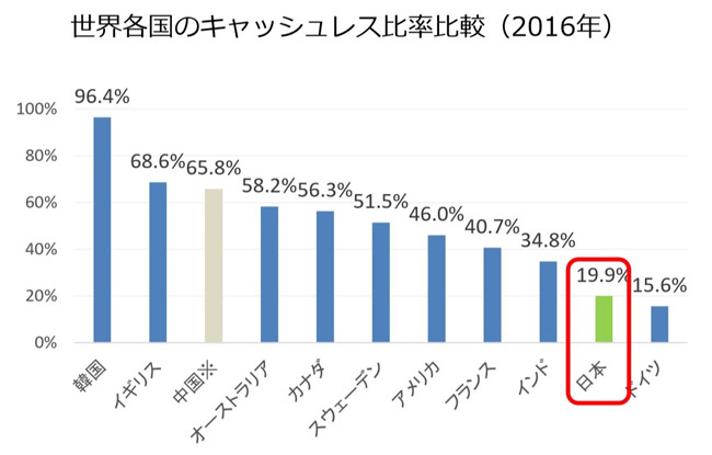 กระทรวงเศรษฐกิจ การค้า และอุตสาหกรรมในญี่ปุ่นออกรายงานเกี่ยวกับ “สถานการณ์สังคมไร้เงินสดของญี่ปุ่นในปัจจุบัน” เมื่อเดือนมกราคม 2020 โดยอ้างอิงข้อมูลจากเอกสาร Cashless Roadmap 2019 ซึ่งเป็นข้อมูลที่เปิดเผยจาก Payments Japan Association ในเอกสารได้ระบุถึงสถานการณ์ Cashless ของประเทศต่าง ๆ ในโลกประจำปี 2016 โดยมีรายละเอียดดังต่อไปนี้