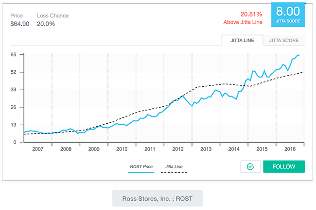 - Jitta Line (เส้นประสีเทา) เป็นค่าที่บ่งบอกถึงมูลค่าที่เหมาะสมของธุรกิจว่าควรจะมีมูลค่าต่อหุ้นเป็นเท่าไหร่ ดังนั้น ยิ่งราคาหุ้นต่ำกว่า Jitta Line แสดงว่าราคาหุ้นยิ่งต่ำกว่ามูลค่ามากขึ้นเท่านั้น ทั้งนี้ Jitta จะมีการแสดงค่า Above/Below Jitta Line เอาไว้ตรงใกล้ ๆ Jitta Score ด้วย เพื่อให้นักลงทุนมองได้ทันทีว่าปัจจุบันราคาหุ้น (เส้นสีฟ้า) สูงหรือต่ำกว่ามูลค่าที่เหมาะสมอยู่เท่าไหร่