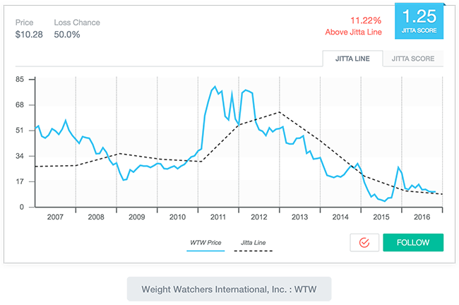 ในกรณีนี้ต้องลองถามตัวเองว่าถ้าหากมีเพื่อนมาขายธุรกิจให้แล้วบอกว่า กำไรจะลดลงเรื่อย ๆ ทุกปี ปีละ 15% เราจะลงทุนกับเพื่อนหรือไม่ แน่นอนว่าคงไม่มีใครอยากลงทุนในบริษัทแบบนี้ ดังนั้นสำหรับหุ้นของกิจการที่มีกำไรลดลง ถ้าเป็นไปได้เราก็ไม่ควรเข้าไปลงทุนตั้งแต่แรกแล้วค่ะ เพราะความเสี่ยงที่จะขาดทุนมีสูงมาก ยิ่งถือหุ้นไว้ยาวเท่าไหร่ราคาหุ้นยิ่งลดลงเรื่อย ๆ เช่น กรณีของ Weight Watchers International, Inc (NYSE:WTW)