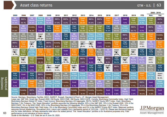 เพื่อให้เห็นภาพมากขึ้นว่าทำไมการจัดสรรสินทรัพย์ในการลงทุน (Asset Allocation) เป็นปัจจัยที่สำคัญ สามารถดูได้จากตารางผลตอบแทนย้อนหลังของสินทรัพย์ต่าง ๆ ระยะเวลา 15 ปีย้อนหลังตั้งแต่ปี 2005 ถึง 2019 จาก JPMorgan จะเห็นได้อย่างชัดเจนเลยว่า ไม่มีสินทรัพย์ใดที่ให้ผลตอบแทนที่ดีที่สุด ทุกสินทรัพย์มีจังหวะและเวลาของตัวเองเสมอ บางปีอาจจะให้ผลตอบแทนสูงมากกว่า 70% แต่บางปีก็อาจจะพาเราไปติดลบได้มากกว่า -50% ได้เช่นกัน
