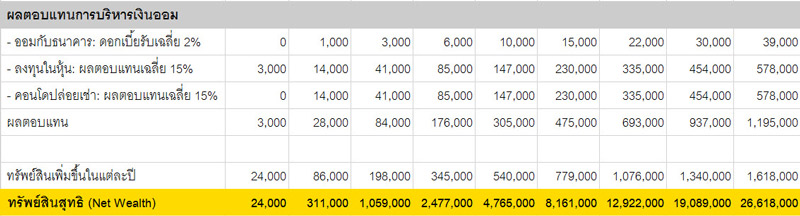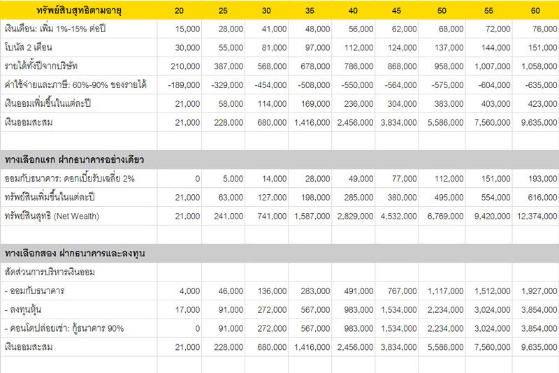ทางเลือกสองฝากธนาคารและลงทุน แบ่งเงินส่วนใหญ่ไปลงทุนในหุ้นและคอนโดปล่อยเช่าให้ทรัพย์สินช่วยสร้างเงินด้วย วิธีนี้ช่วยให้คุณมีอิสรภาพทางการเงินก่อนวัยเกษียณ เพราะตอนอายุครบ 52 ปีมีทรัพย์สินสุทธิ (Net Wealth) ถึง 15.2 ล้านบาทเพียงพอใช้จ่ายไปตลอดชีวิต และหากคุณเลือกที่จะหยุดทำงานประจำตอนอายุ 55 ปี คุณจะมีทรัพย์สินสุทธิ 19.1 ล้านบาทและยังมีรายได้ไปเรื่อยๆทุกปีจากเงินลงทุนปีละ 937,000 บาทไปจนบั้นปลายชีวิตครับ (การลงทุนมีความเสี่ยง ควรศึกษาให้ดีก่อนลงทุนนะครับ)