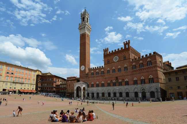 ถ้าอยากเติมความหวานให้คู่ของคุณมากขึ้น ลองมาเดินเที่ยวเล่นที่จัตุรัสกัมโป (Piazza del Campo) พื้นที่จัตุรัสใจกลางเมืองเซียนา เป็นที่ตั้งของสถานที่สำคัญหลายแห่ง สิ่งที่สะดุดตาทุกคนก็หนีไม่พ้นสถาปัตยกรรมยุคกลางที่ได้รับการยอมรับว่าสวยสมบูรณ์แบบที่สุดแห่งหนึ่งในทวีปยุโรปเลยล่ะครับ ไม่ว่าจะเดินไปมุมไหน ก็สวยทุกซอกทุกมุม พื้นที่จตุรัสแห่งนี้เป็นที่ตั้งของหอระฆังมานเจีย (Torre del Mangia) หอระฆังโบราณ เป็นสิ่งก่อสร้างที่สูงสุดในเมือง แล้วยังมีมหาวิหารเซียนา (Duomo di Siena) สถานที่สำคัญที่ไม่ควรพลาด โดดเด่นด้วยสถาปัตยกรรมแนวกอธิคและเรอเนซองส์ ด้านหน้าของมหาวิหารประดับด้วยรูปแกะสลักหิน ด้านข้างเป็นหินอ่อนสีขาวและสีเขียวสลับเขียวดำ บริเวณรอบๆ ยังเต็มไปด้วยร้านอาหารหลายแห่งที่พร้อมให้บริการนักท่องเที่ยวได้ลิ้มรสชาติอาหารอิตาลีแบบดั้งเดิม รับรองว่าต้องหลงเสน่ห์เมืองนี้แน่นอน