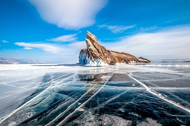 เริ่มต้นกันที่แลนด์มาร์คสำคัญ ไม่ว่าใครที่ไปไบคาลก็ต้องถ่ายรูปที่จุดนี้ คือ ภูเขากลางทะเลสาบน้ำแข็ง ที่มีพื้นน้ำแข็งหนาประมาณ 80-120 เซนติเมตร ท่ามกลางอุณหภูมิที่ลบต่ำสุดๆ ถึงเกือบ 40 องศาเซลเซียส ภูเขากลางทะเลสาบน้ำแข็งแห่งนี้ยังตั้งโดดเด่น รอผู้เดินทางแวะมาทักทายอยู่ตลอดเวลา