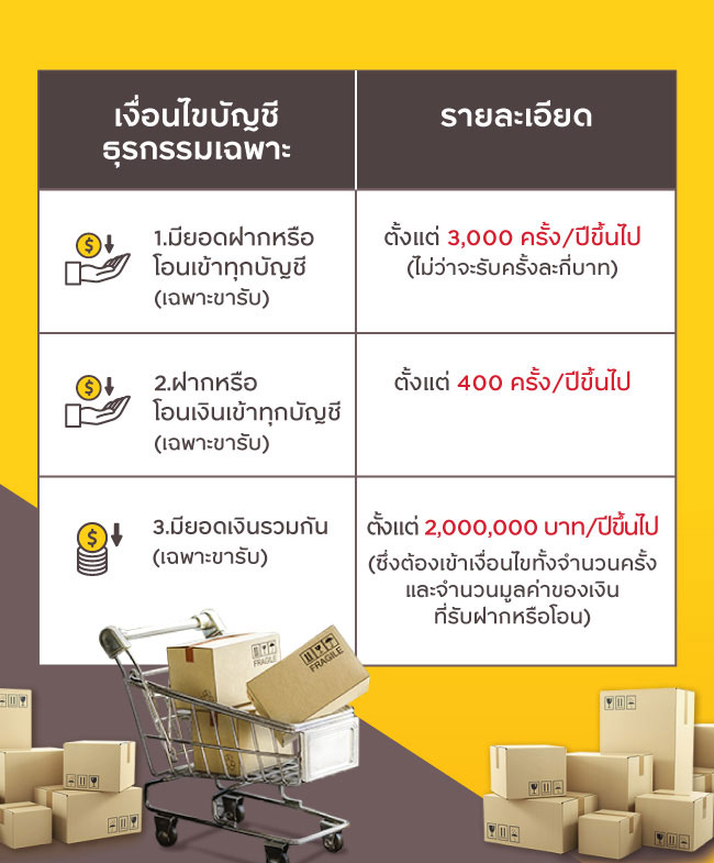 เมื่อคุณเป็นพ่อค้า/แม่ค้าออนไลน์เต็มตัวแล้ว สิ่งต่อมาที่คุณต้องรู้และคำนึงถึง กฎเกณฑ์การขายของออนไลน์ต่างๆ หนึ่งในนั้นคือ เรื่องการเสียภาษีของร้านค้าออนไลน์ ซึ่งถือเป็นกฎหมายใหม่ล่าสุด หลังจากมีการพูดถึงแนวทางการจัดเก็บภาษีกับพ่อค้า/แม่ค้าออนไลน์มาโดยตลอด ในที่สุดกฎหมายก็ได้คลอดออกมาแล้ว โดยมีชื่อว่า ภาษีอีเพย์เมนต์ พ.ศ. 2562 โดยให้มีผลบังคับใช้ตั้งแต่วันที่ 21 มีนาคม 2562 และให้สถาบันการเงินส่งรายงานธุรกรรมครั้งแรกต่อกรมสรรพากร ภายในวันที่ 31 มีนาคม 2563 ใจความสำคัญคือ การกำหนดให้สถาบันการเงิน และผู้ให้บริการทางการเงินอิเล็กทรอนิกส์ e-wallet ต้องรายงานข้อมูลผู้มีบัญชีธุรกรรมเฉพาะให้กรมสรรพากรทราบ ไม่ว่าจะเป็นบุคคลธรรมดา นิติบุคคล (ผู้ที่จดทะเบียนเป็นห้างหุ้นส่วนจำกัด หรือบริษัท) ทั้งคนไทยและชาวต่างชาติ โดยบัญชีธุรกรรมเฉพาะจะต้องมีเงื่อนไข ดังต่อไปนี้